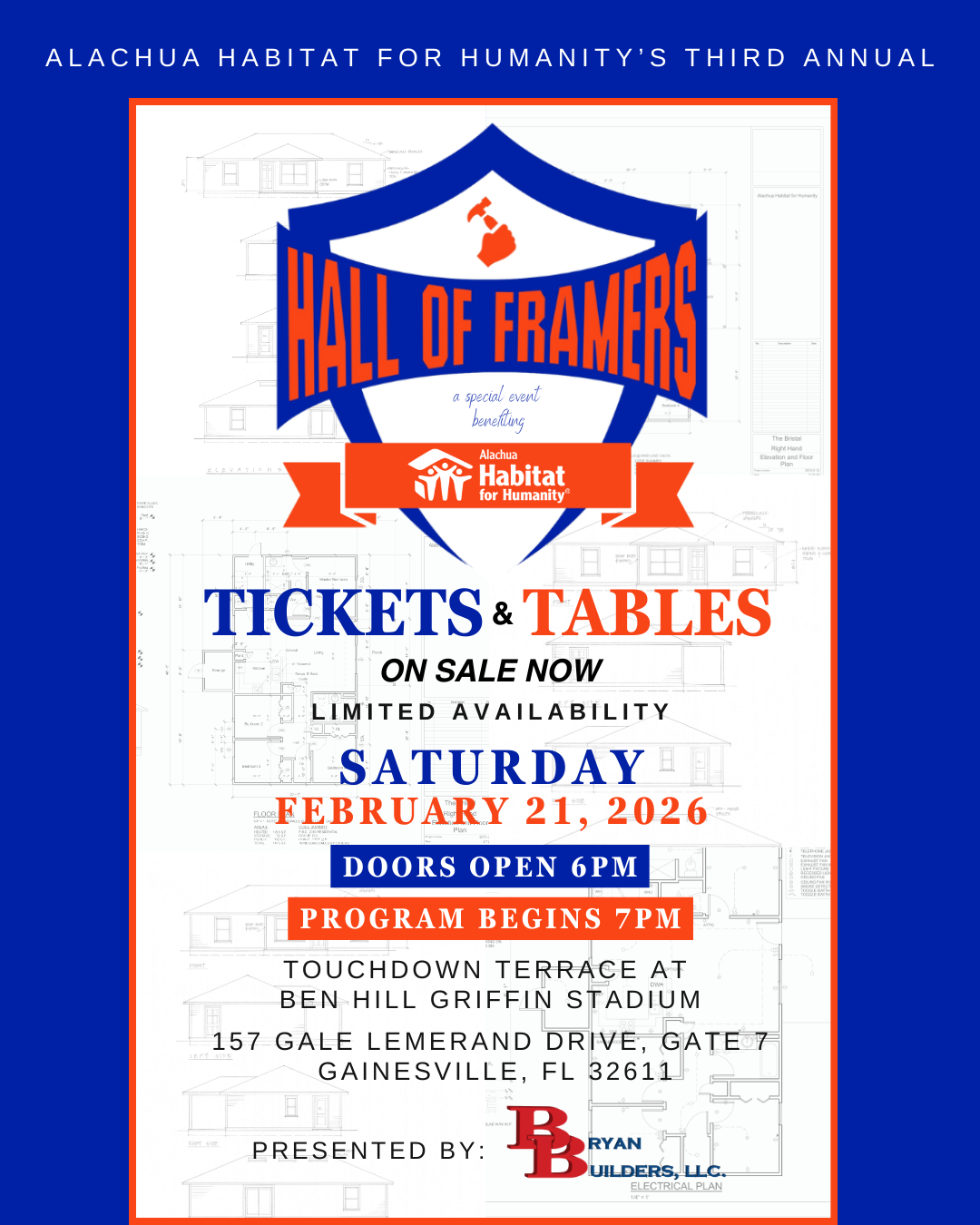 Get ready for an incredible evening at our 3rd Annual Hall of Framers, presented by Bryan Builders, LLC! This signature celebration brings together community partners, Gator greats, and Habitat supporters for a night of inspiration and impact. Guests will enjoy live and silent auctions, Florida Gators guests, and powerful stories of homeownership and hope from local Habitat families.